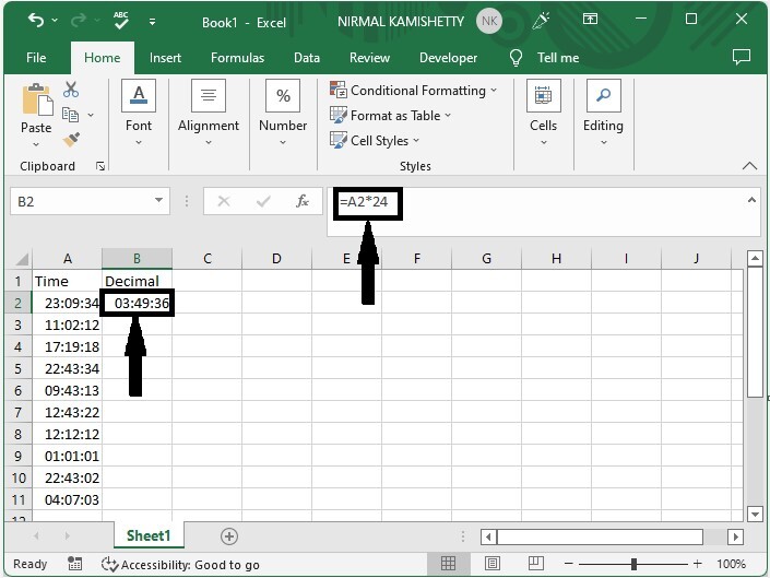 現在,單擊一個空單元格,在本例中為單元格 B2,然後輸入公式 =A2*24 並單擊 Enter 以獲取我們的第一個結果,如下面的影像所示。