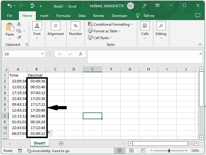在這裡,我們將使用公式獲取任意一個值,然後使用自動填充柄填充所有值,並使用“格式”功能完成任務。讓我們瞭解一下使用公式在 Excel 中將時間轉換為小數時間的簡單步驟。