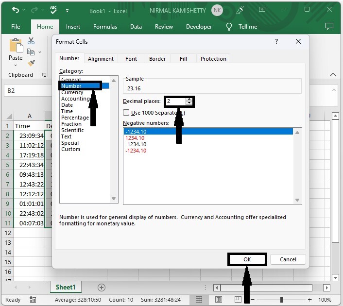 現在我們需要將這些值轉換為小數。為此,選擇資料,然後右鍵單擊並選擇“設定單元格格式”。然後單擊“數字”,將小數位數更改為兩位,然後單擊“確定”,如下面的影像所示,以完成我們的過程。