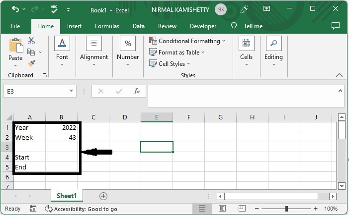 讓我們考慮一個 Excel 表格,其中表格中的資料類似於下圖所示的資料。我們需要確定給定年份中指定周的開始和結束日期。