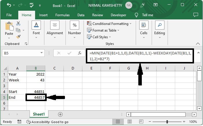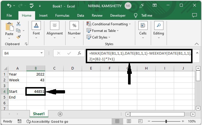 現在要獲取開始日期,在我們的例子中是單元格 B4,單擊一個空單元格並輸入公式 =MAX(DATE(B1,1,1),DATE(B1,1,1)-WEEKDAY(DATE(B1,1,1), 2)+(B2-1)*7+1) 並按回車鍵。在公式中,B1 是我們年份的地址,B2 是週數的地址。