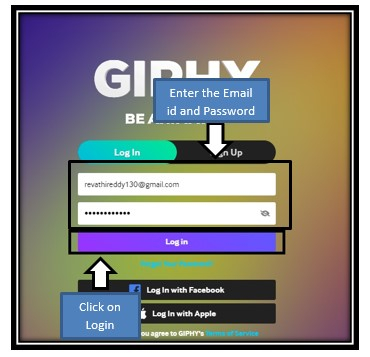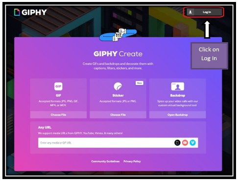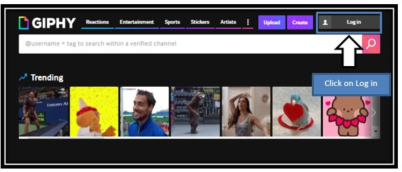 步驟 2 − 你將進入此頁面(如下所示)。你需要在 GIPHY 網站上建立一個帳戶才能製作動畫 GIF,然後單擊網站右上角的“登入”按鈕(如下所示)。