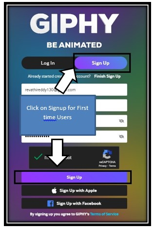 步驟 3 − 你將進入此頁面(如下所示)。如果你沒有 GIPHY 帳戶,請單擊“註冊”按鈕。輸入電子郵件地址、使用者名稱、密碼和確認密碼,選中“我不是機器人”複選框,然後單擊“註冊”按鈕。