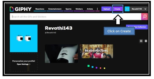 步驟 7 − 前往 GIPHY 首頁並單擊“建立”選項,如下圖所示。