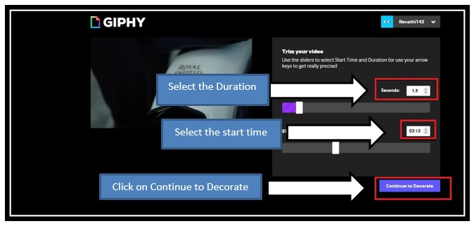 步驟 9 − 將 YouTube URL 連結貼上到搜尋欄後,你將進入此頁面(如下所示)。選擇 GIF 的持續時間和開始時間。在這裡,我選擇了持續時間 – 1.5 秒和開始時間 – 3:13 秒,然後單擊“繼續裝飾”按鈕。