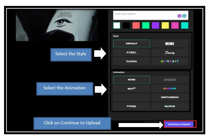 步驟 10 − 你將進入此頁面。在這裡,你可以為 GIF 新增標題,提供 GIF 的樣式和動畫型別,然後單擊“繼續上傳”。
