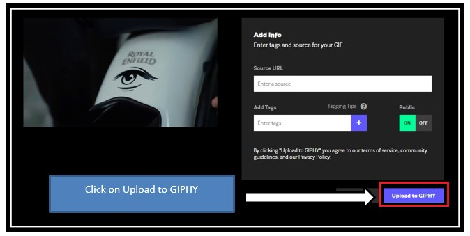 步驟 11 − 輸入來源 URL 為 YouTube,如果需要可以新增標籤,但不是必須的,然後單擊“上傳到 GIPHY”按鈕。