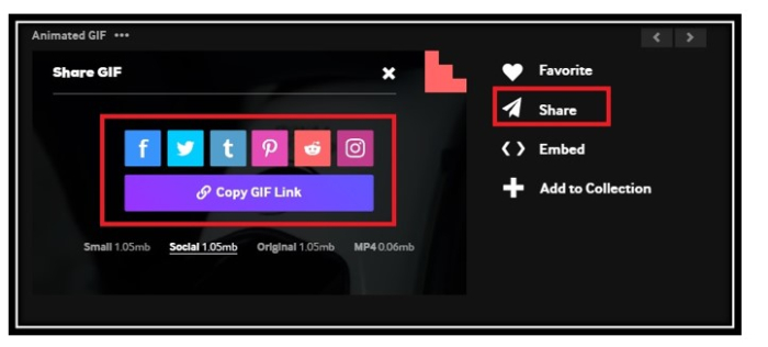 步驟 13 − 單擊“分享”按鈕(如下所示)。你可以在你的社交媒體帳戶(Facebook、Twitter、Instagram、Pinterest 等)上分享 GIF,或複製 URL 連結或新增到收藏夾。