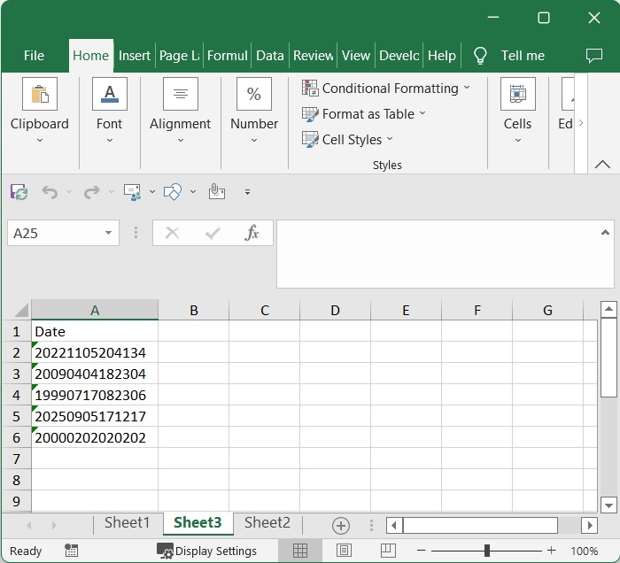 考慮一個 Excel 工作表,其中資料是以“yyyymmddhhmmss”格式表示的日期列表,如下面的影像所示。