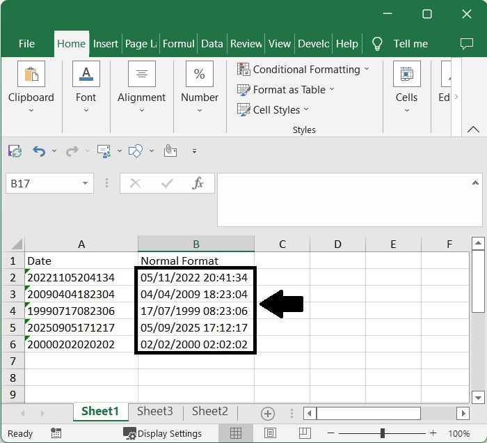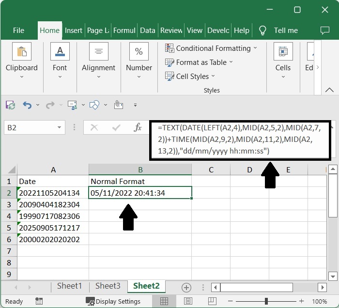 注意 - 我們也可以使用公式 =--TEXT(A2,"0000\-00\-00\ 00\:00\:00"),但我們需要格式化單元格才能完成任務。
