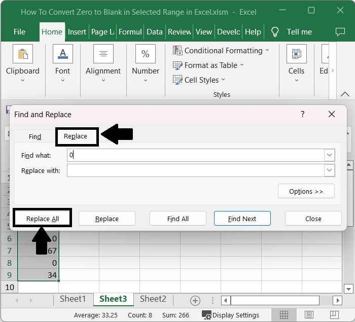 現在在彈出視窗中,單擊“替換”,然後在“查詢內容”中輸入 0,在“替換為”中輸入空格。