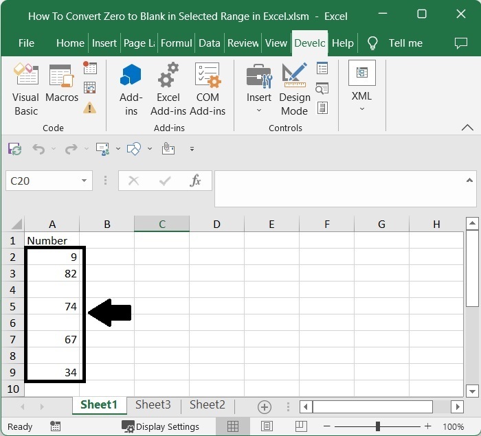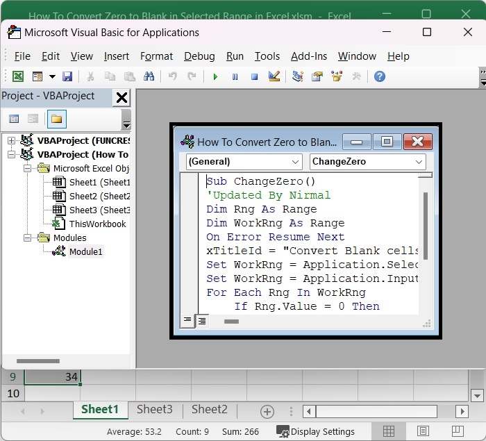 在這裡,我們將首先開啟 VBA 應用程式,然後輸入並將程式碼複製到文字框中。讓我們看看一個在 Excel 區域中將零轉換為空白的簡單過程。