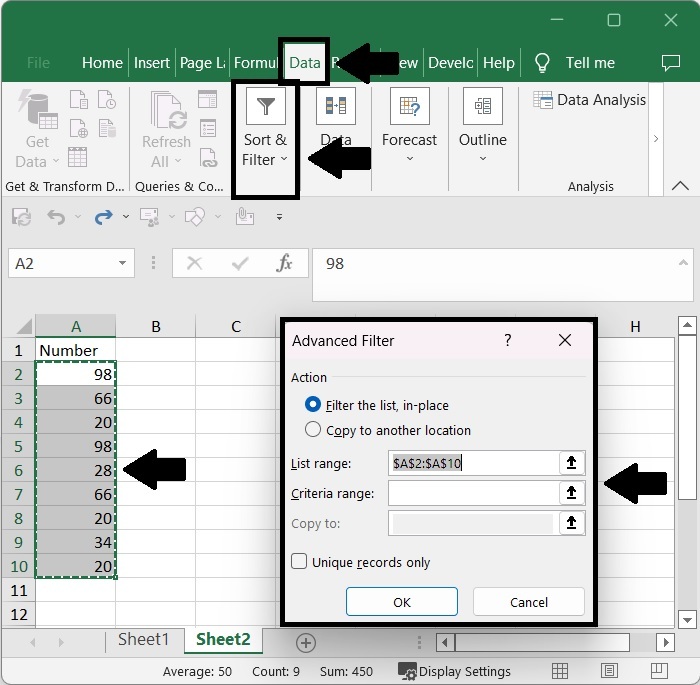 現在選擇要複製的工作表上的資料範圍,然後單擊“確定資料”,然後選擇“高階篩選器”以開啟彈出視窗。