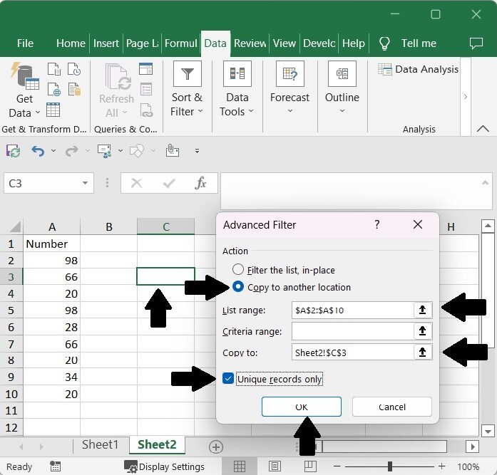 然後,在彈出視窗中,單擊“複製到其他位置”,並指定要在標記為“複製到”的文字框中開始新值的位置,然後選中“僅唯一記錄”複選框,然後單擊“確定”,如下面的影像所示。