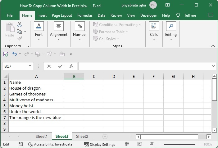 在這裡,我們將首先以預設方式複製資料並使用“選擇性貼上”功能。讓我們來看一下在 Excel 中複製列寬格式的簡單步驟。