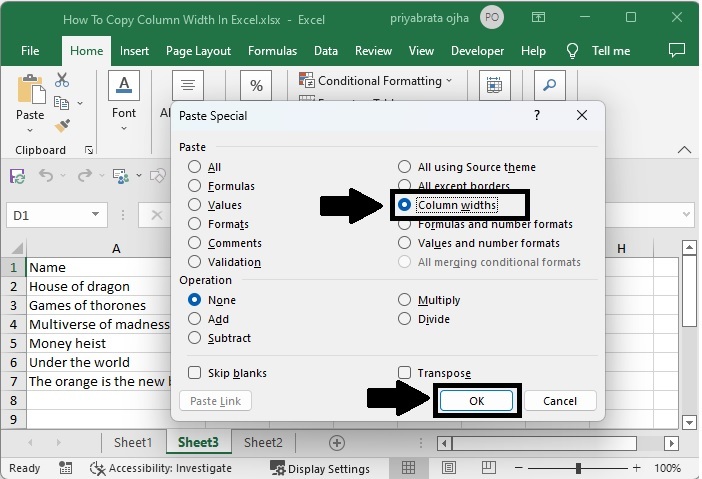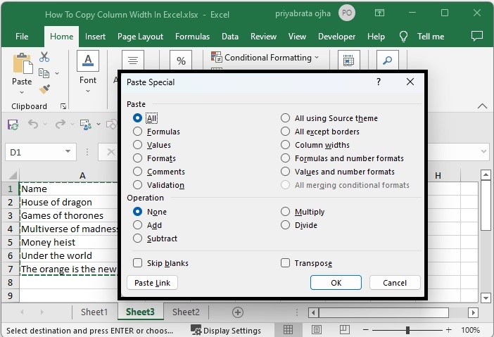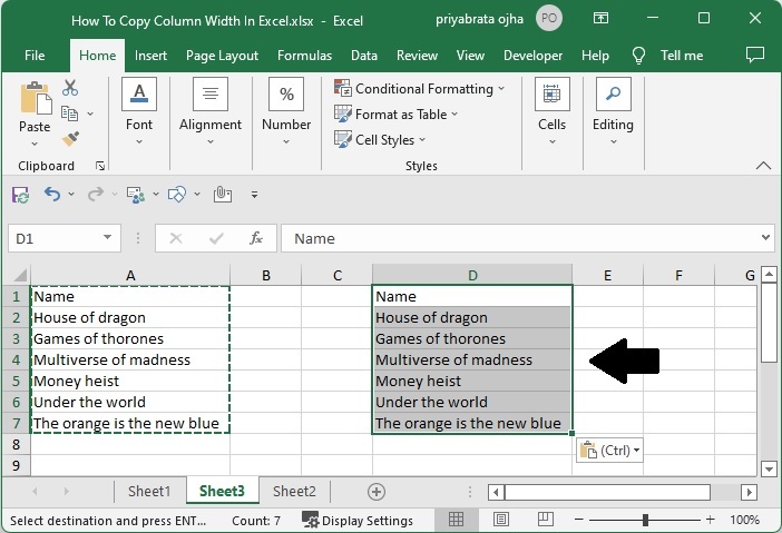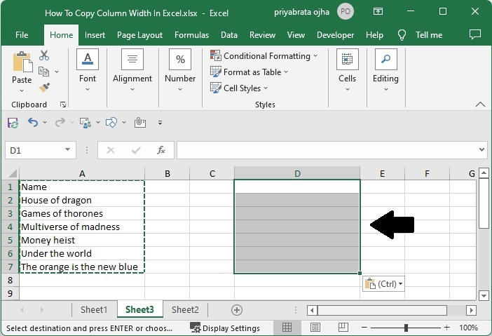 選擇要複製的單元格區域,並使用命令 CTRL + C 複製資料,然後單擊要貼上資料的單元格,右鍵單擊並單擊“選擇性貼上”,然後選擇“保持源列寬”,我們的結果將類似於下圖。