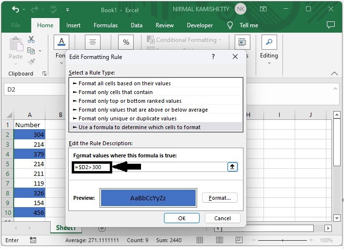 然後從列表中選擇“自定義”,輸入公式 =A2>300,單擊“格式”,然後單擊“填充”,選擇顏色,然後單擊“確定”。