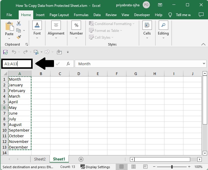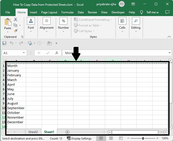 在這裡,我們將使用地址框選擇資料,然後複製資料,最後貼上資料。讓我們來看一下使用名稱框從受保護工作表複製資料的簡單過程。
