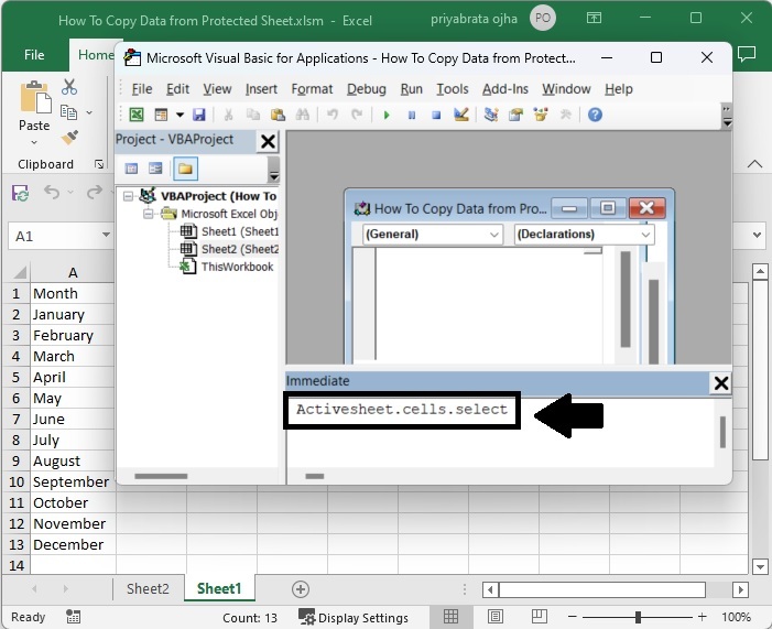 然後右鍵單擊工作表名稱並選擇“檢視程式碼”以開啟 VBA 應用程式。然後在 vba 應用程式中,使用“CTRL + G”命令開啟立即視窗,並在文字框中輸入“Activesheet.cells.select”,如下圖所示,然後單擊回車鍵。