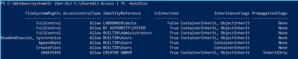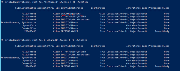 檢視上面安全許可權的差異,名為 Shared 的資料夾分配了一個額外的許可權 (LABDOMAIN\Delta)。我們將使用源的 Get-ACL 和目標路徑的 Set-ACL 透過管道將許可權從一個資料夾複製到另一個資料夾。