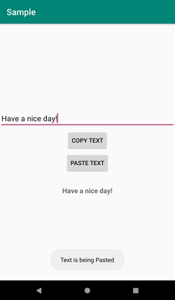 <?xml version="1.0" encoding="utf-8"?> <LinearLayout xmlns:android="http://schemas.android.com/apk/res/android" xmlns:tools="http://schemas.android.com/tools" android:layout_width="match_parent" android:layout_height="match_parent" android:orientation="vertical" android:gravity="center" tools:context=".MainActivity"> <EditText android:id="@+id/editText" android:layout_width="match_parent" android:layout_height="wrap_content" android:hint="Enter your text"/> <Button android:onClick="CopyText" android:layout_width="wrap_content" android:layout_height="wrap_content" android:layout_marginTop="5dp" android:text="Copy text"/> <Button android:onClick="PasteText" android:layout_width="wrap_content" android:layout_height="wrap_content" android:layout_marginTop="5dp" android:text="Paste text" /> <TextView android:id="@+id/textView" android:layout_marginTop="30dp" android:textSize="16sp" android:textStyle="bold" android:layout_width="wrap_content" android:layout_height="wrap_content" /> </LinearLayout>