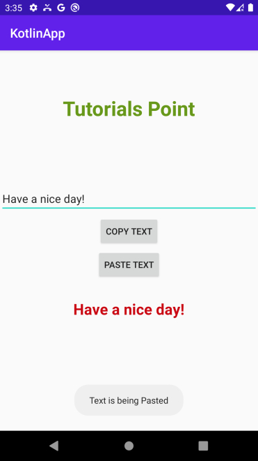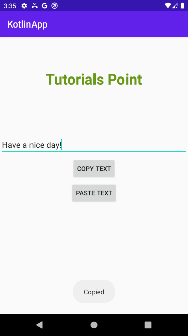 <?xml version="1.0" encoding="utf-8"?> <LinearLayout xmlns:android="http://schemas.android.com/apk/res/android" xmlns:tools="http://schemas.android.com/tools" android:layout_width="match_parent" android:layout_height="match_parent" android:gravity="center_horizontal" android:orientation="vertical" tools:context=".MainActivity"> <TextView android:layout_width="wrap_content" android:layout_height="wrap_content" android:layout_marginTop="70dp" android:text="Tutorials Point" android:textAlignment="center" android:textColor="@android:color/holo_green_dark" android:textSize="32sp" android:textStyle="bold" /> <EditText android:id="@+id/editText" android:layout_width="match_parent" android:layout_height="wrap_content" android:layout_marginTop="100dp" android:hint="Enter your text" /> <Button android:layout_width="wrap_content" android:layout_height="wrap_content" android:layout_marginTop="5dp" android:onClick="copyText" android:text="Copy text" /> <Button android:layout_width="wrap_content" android:layout_height="wrap_content" android:layout_marginTop="5dp" android:onClick="pasteText" android:text="Paste text" /> <TextView android:textColor="@android:color/holo_red_dark" android:id="@+id/textView" android:layout_width="wrap_content" android:layout_height="wrap_content" android:layout_marginTop="30dp" android:textSize="24sp" android:textStyle="bold" /> </LinearLayout>