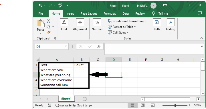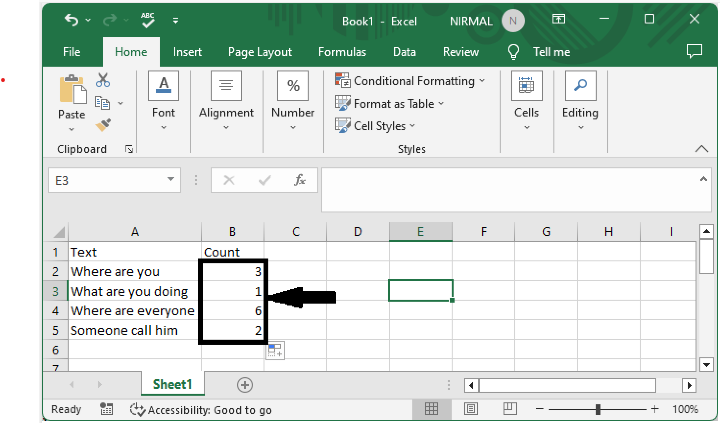 首先,我們將使用公式獲得其中一個結果,然後使用自動填充柄完成任務。讓我們來看一個簡單的過程,瞭解如何在Excel單元格中統計特定字元的出現次數。