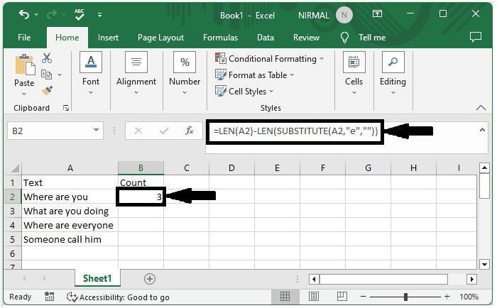 =LEN(A2)-LEN(SUBSTITUTE(A2,"e","")) 並點選回車鍵以獲得第一個結果。