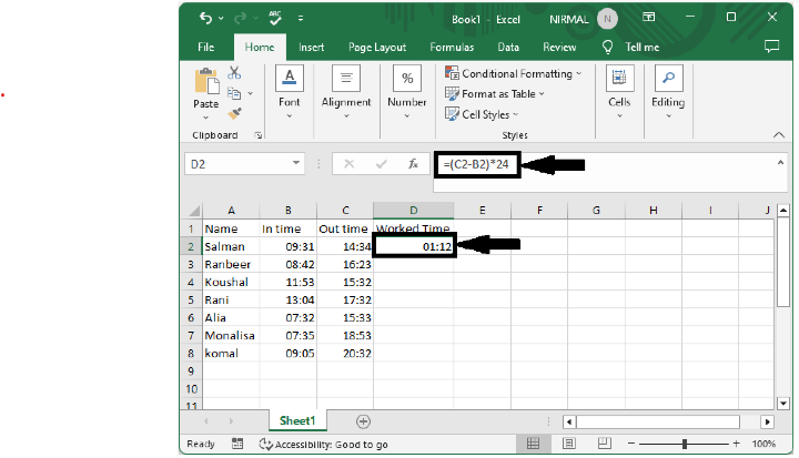 現在,單擊一個空單元格,在本例中為單元格 D2,然後輸入公式 =(C2-B2)*24 並單擊回車鍵以獲取第一個結果。