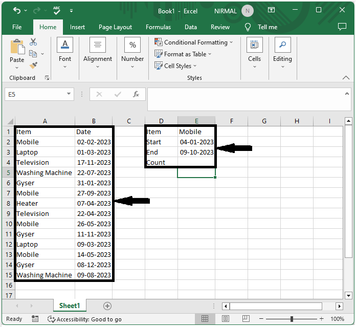 在這裡,我們可以直接使用單個公式獲得結果。讓我們來看一個簡單的過程,演示如何在 Excel 中根據匹配條件統計兩個日期之間的記錄數。