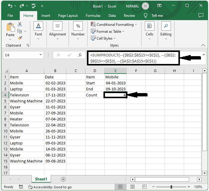 首先,點選任何空白單元格,在本例中為單元格 E4,並輸入公式 `=SUMPRODUCT(--($B$2:$B$15>=$E$2), --($B$2:$B$15<=$E$3), --($A$2:$A$15=$E$1))`,然後點選回車鍵獲取結果。