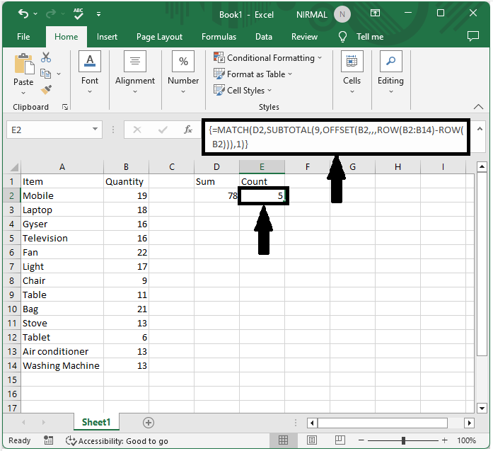 =MATCH(D2,SUBTOTAL(9,OFFSET(B2,,,ROW(B2:B14)-ROW(B2))),1) 並