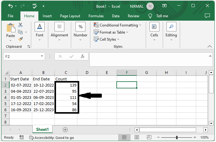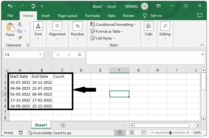 考慮一個 Excel 表格,其中您有兩個日期列表,分別是開始日期和結束日期,如下面的影像所示。