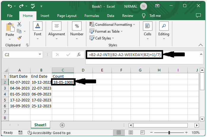 首先,單擊一個空單元格,在本例中為單元格 C2,然後輸入公式 =B2-A2-INT((B2-A2-WEEKDAY(B2)+1)/7),然後單擊 Enter 以獲得第一個結果。