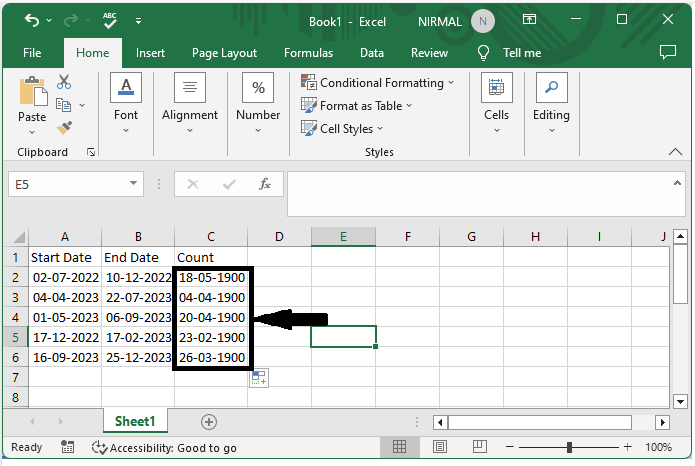 在這裡,我們將首先使用公式獲得任何一個結果,然後使用自動填充柄填充所有結果,然後格式化單元格以完成任務。因此,讓我們來看一個簡單的過程,瞭解如何計算 Excel 中兩個日期之間不包括週日的日期數。