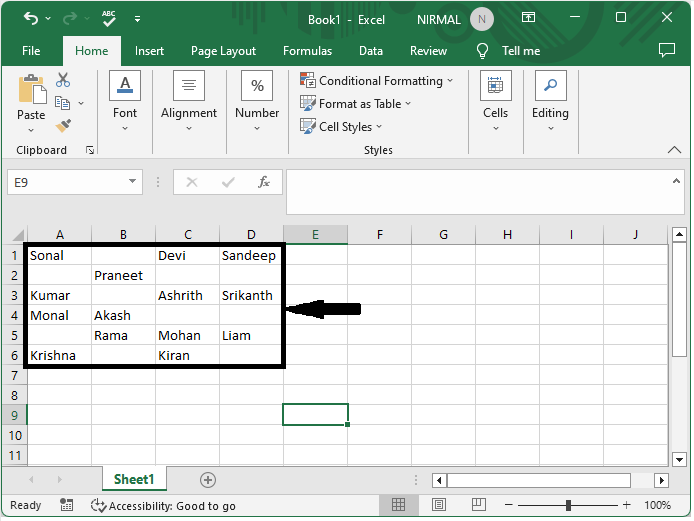考慮一個 Excel 表格,其中包含任何型別的資料以及其中的隨機空格,類似於下圖。