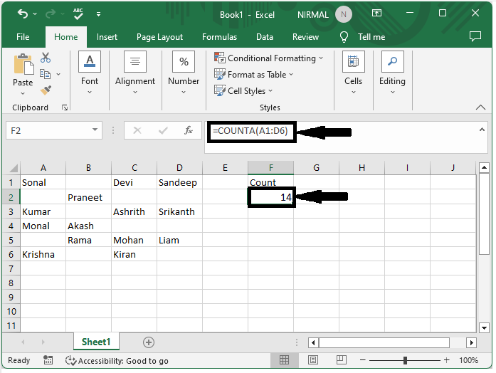 現在點選一個空單元格,在本例中為單元格 F2,並輸入公式 =COUNTA(A1:D6),然後點選回車鍵以獲取第一個結果。在公式 A1:D6 中,a 是包含資料範圍的單元格的地址。