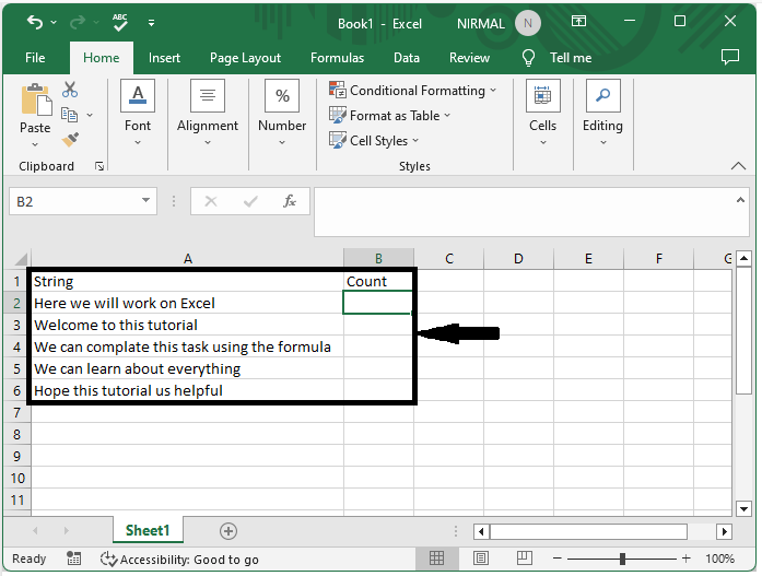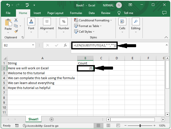 現在,首先單擊一個空單元格,並輸入公式 =LEN(SUBSTITUTE(A2," ","")),然後單擊回車鍵獲取第一個結果。在公式中,A2 是包含句子的單元格的地址。