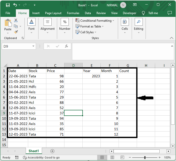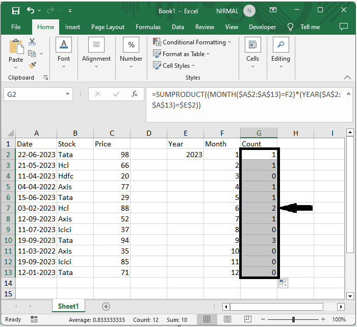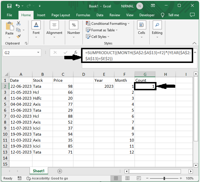 首先,要計算出現次數,單擊一個空單元格,輸入公式`=SUMPRODUCT((MONTH($A$2:$A$24)=F2)*(YEAR($A$2:$A$24)=$E$2))`,然後單擊回車鍵以獲得第一個值。