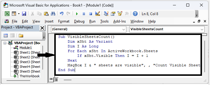 在這裡,我們將首先建立一個 VBA 模組,然後執行它來完成任務。因此,讓我們看看一個簡單的過程來學習如何在 Excel 中計算工作簿中可見工作表的數量。