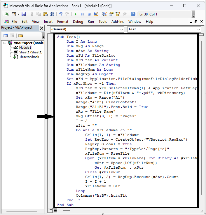 Sub Test() Dim I As Long Dim xRg As Range Dim xStr As String Dim xFd As FileDialog Dim xFdItem As Variant Dim xFileName As String Dim xFileNum As Long Dim RegExp As Object Set xFd = Application.FileDialog(msoFileDialogFolderPicker) If xFd.Show = -1 Then xFdItem = xFd.SelectedItems(1) & Application.PathSeparator xFileName = Dir(xFdItem & "*.pdf", vbDirectory) Set xRg = Range("A1") Range("A:B").ClearContents Range("A1:B1").Font.Bold = True xRg = "File Name" xRg.Offset(0, 1) = "Pages" I = 2 xStr = "" Do While xFileName <> "" Cells(I, 1) = xFileName Set RegExp = CreateObject("VBscript.RegExp") RegExp.Global = True RegExp.Pattern = "/Type\s*/Page[^s]" xFileNum = FreeFile Open (xFdItem & xFileName) For Binary As #xFileNum xStr = Space(LOF(xFileNum)) Get #xFileNum, , xStr Close #xFileNum Cells(I, 2) = RegExp.Execute(xStr).Count I = I + 1 xFileName = Dir Loop Columns("A:B").AutoFit End If End Sub