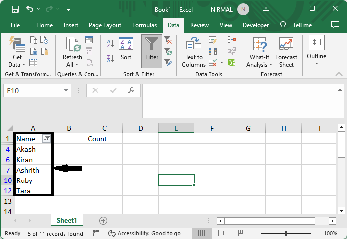 在這裡,我們將直接使用公式完成任務。因此,讓我們瞭解一個簡單的過程,學習如何在 Excel 中計算篩選列中的唯一值。