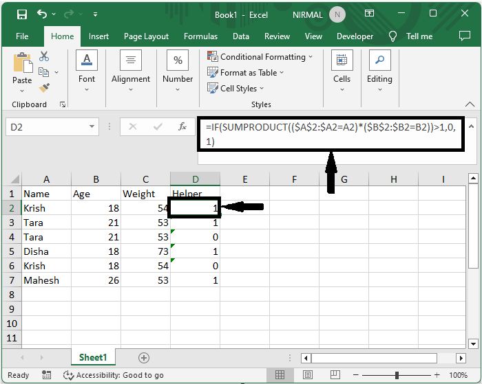 首先,在資料中新增一個名為“輔助”的新列,並輸入公式 `=IF(SUMPRODUCT(($A$2:$A2=A2)*($B$2:$B2=B2))>1,0,1)`,然後按 Enter 鍵。然後使用自動填充柄向下拖動。