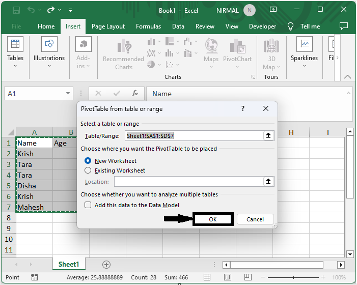 然後選擇單元格範圍,單擊“插入”下的“資料透視表”,然後單擊“確定”。