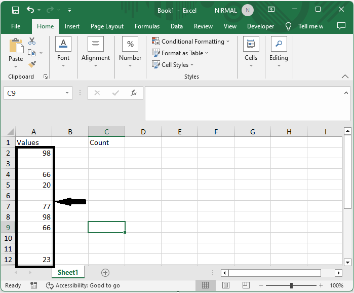 在這裡,我們可以直接使用公式完成任務。讓我們看看一個簡單的過程,瞭解如何統計Excel列中包含空單元格的唯一值。