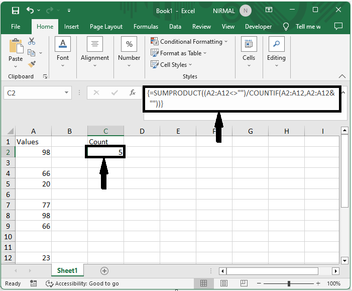 =SUMPRODUCT((A2:A12<>"")/COUNTIF(A2:A12,A2:A12&"")) 並按Ctrl + Shift + Enter。