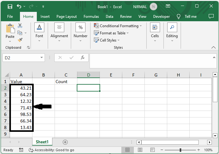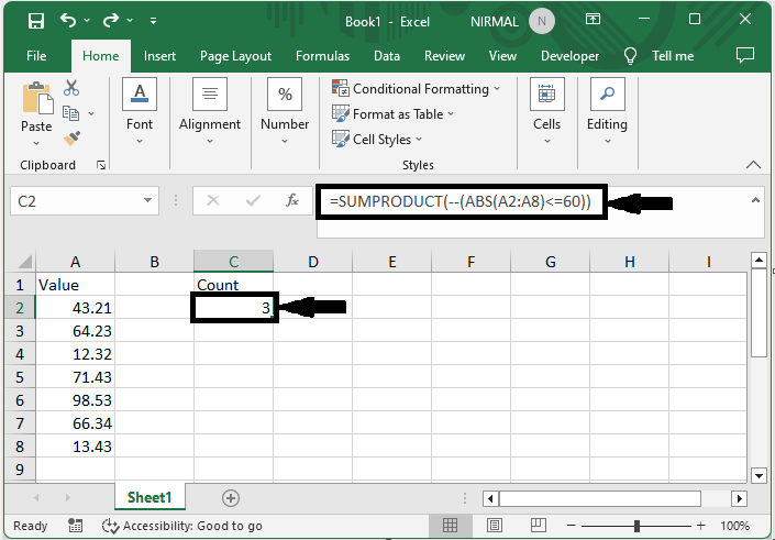 首先,單擊一個空單元格,在本例中為單元格 D2,並輸入公式 =SUMPRODUCT(--(ABS(A2:A8)<=60)),然後單擊回車鍵以完成任務。在公式中,A2:A8 是單元格範圍,60 是要比較的值。