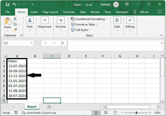 假設您有一個Excel表格,其中包含類似於下圖所示的日期列表。