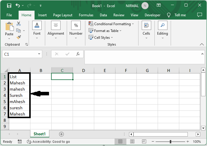 考慮一個 Excel 表格,其中您有一系列具有相似名稱但大小寫不同的專案,類似於下圖。