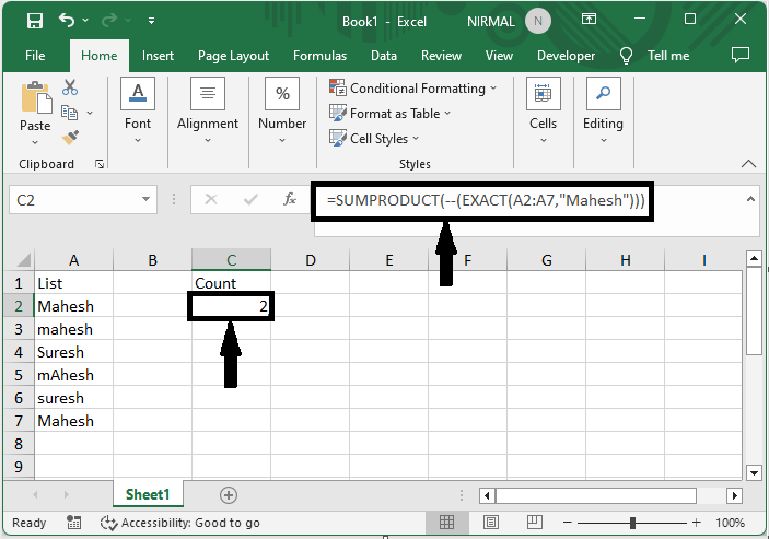 首先,要進行區分大小寫的計數,單擊一個空單元格(在本例中為單元格 B2),然後輸入公式 `=SUMPRODUCT(--(EXACT(A2:A7,"Mahesh"))) `,然後按 Enter 鍵。在公式中,A2:A7 是單元格範圍,“Mahesh”是我們正在查詢的內容。